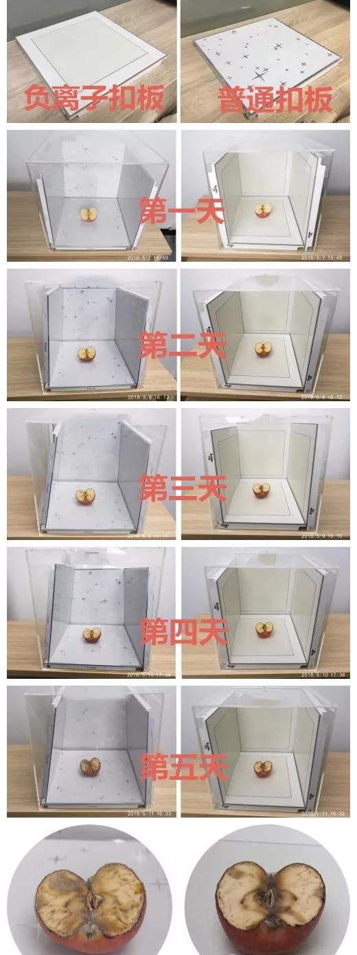 巴迪斯曾經用蘋果做過一次試驗,分別用普通扣板和負離子扣板將蘋果隔離,觀察他們的氧化情況: