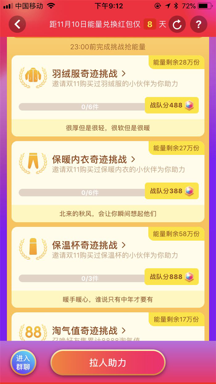 此次雙十一戰隊PK號稱瓜分10億紅包,可真正想要換取紅包可不容易。第一階段為:PK贏能量;第二階段為:挑戰贏能量;第三階段為:能量兌紅包。PK時間從10月20日一直到11月11日,而其規則之復雜令許多網友至今沒搞懂。?而這個套路就在于讓你在各種游戲互助中消耗腦力,導致根本沒有時間思考,最后全權買單,細想并沒有得到優惠。
