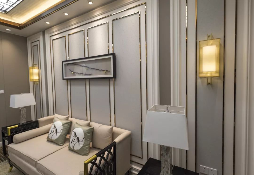 客廳吊頂不僅是因?yàn)槠湓诩已b面積中占比大,還因?yàn)槠鋯沃当壤h(yuǎn)遠(yuǎn)高于其他空間。因此設(shè)計(jì)師在進(jìn)行設(shè)計(jì)的時(shí)候,特意將新中式的板材及巴迪斯六代輕奢旗艦店的輕奢風(fēng)格巧妙融合,以獨(dú)特的新中式風(fēng)格吸引消費(fèi)者的目光,有利于消費(fèi)者購買的欲望。