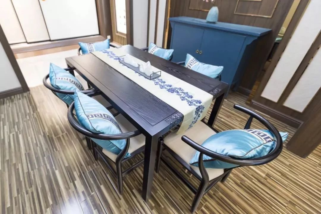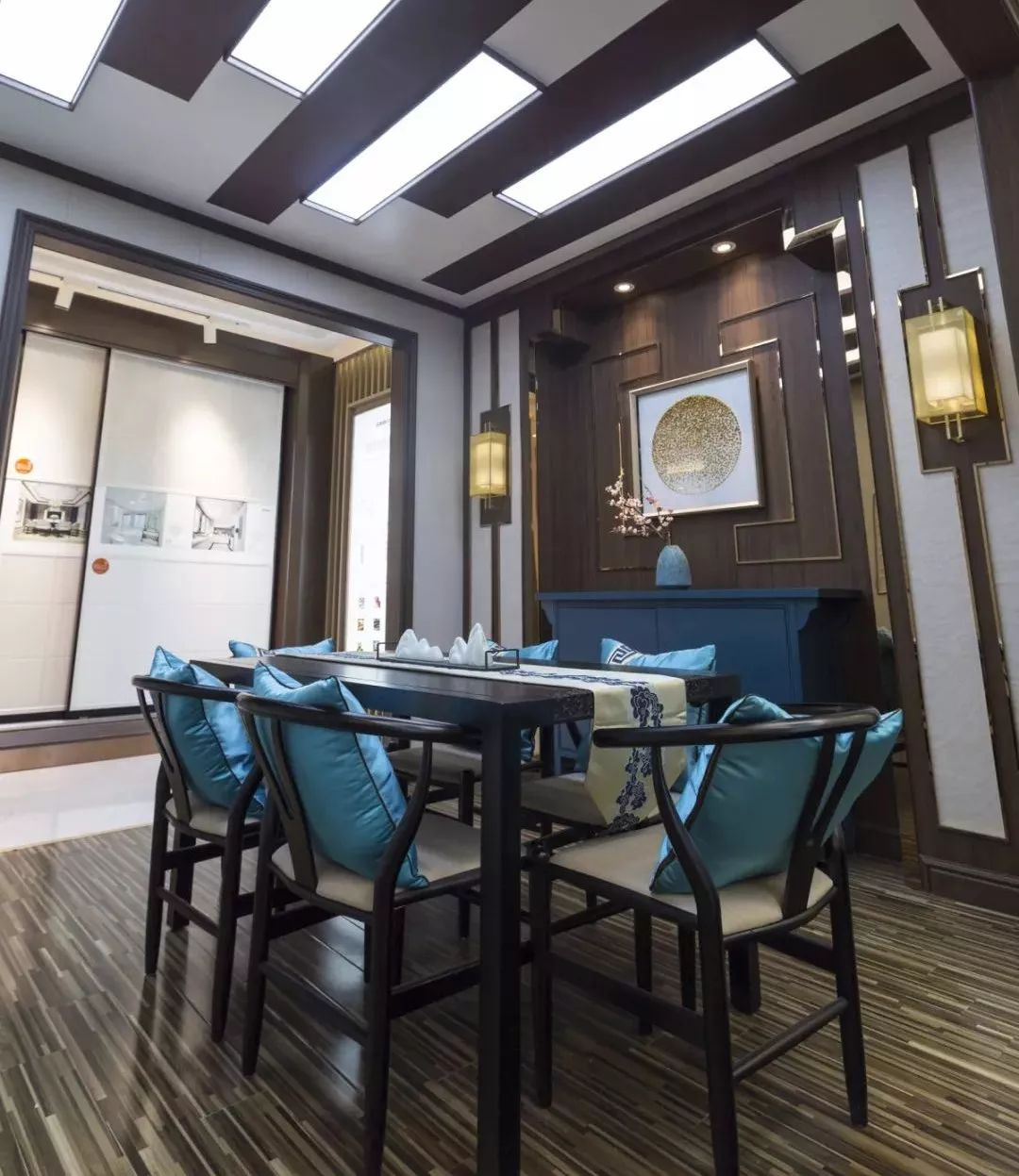 新中式餐廳模擬空間,利用墻板、燈飾、吊頂?shù)耐昝来钆洌瑥氐准ぐl(fā)出新中式的特性。在一天奔波勞碌之后,放下生活中的緊張與疲憊,與家人共進(jìn)晚餐,舒緩心神。