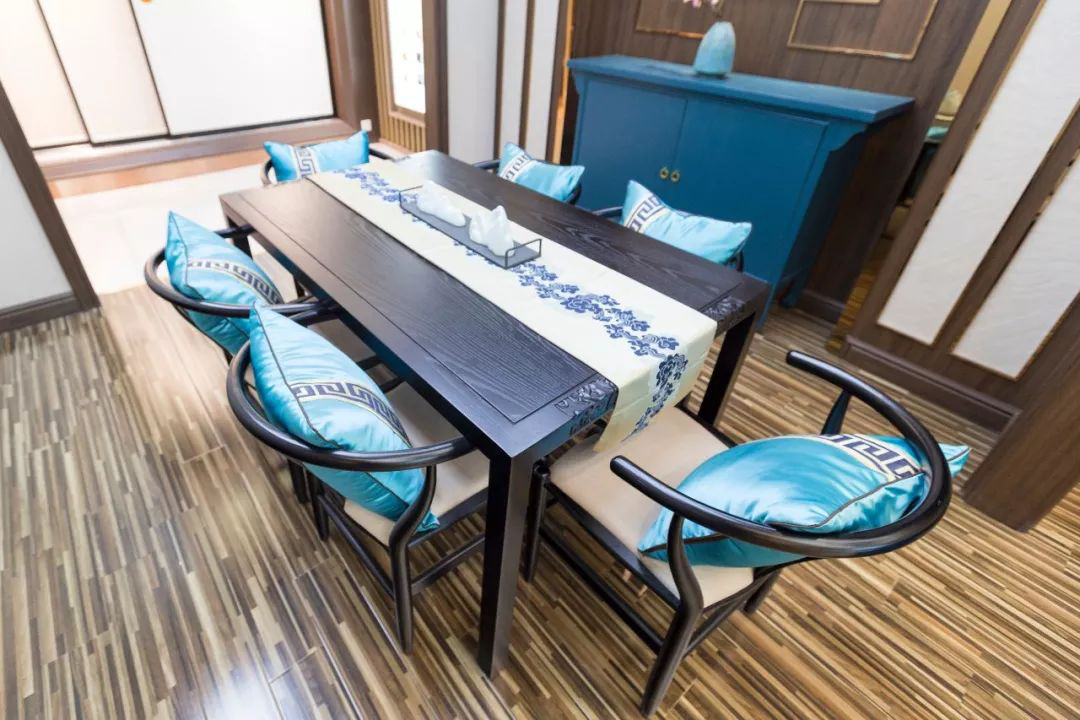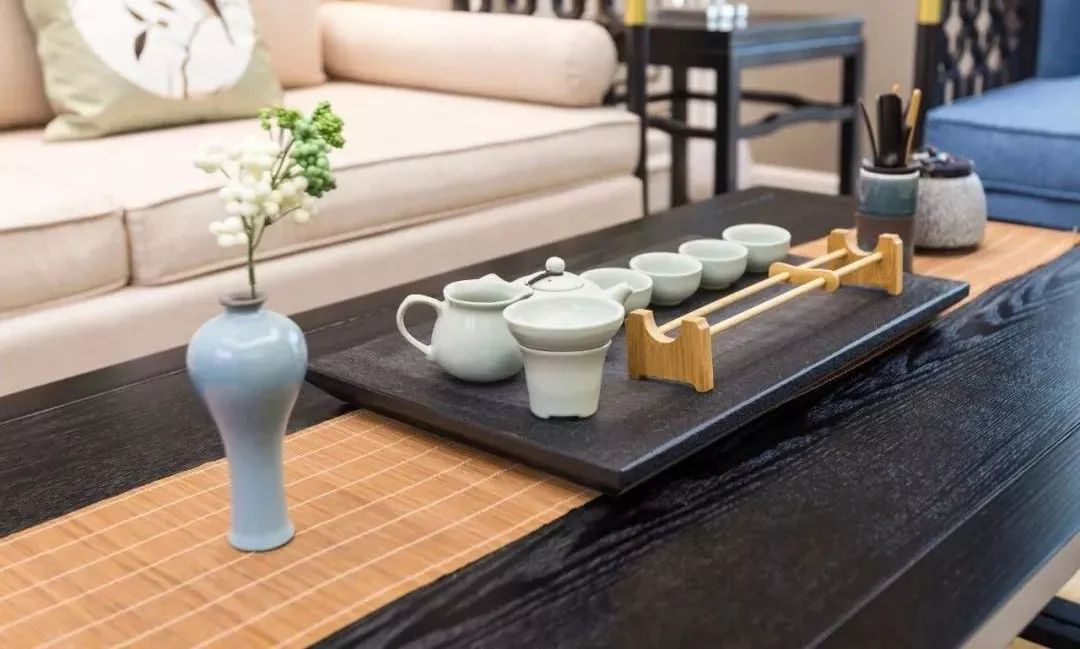 木質家具與墻上掛畫,奠定了客廳的風格基調,融合了中式的莊重與優雅雙重氣質。桌上的陶瓷茶具筑成整個客廳的點睛之筆,為中式風格注入了活力,增添了一份輕松歡快。茶具除了裝飾作用外,還可以讓消費者在參觀之余,坐下來品一壺好茶,慢慢品味極具東方韻味的中式客廳。