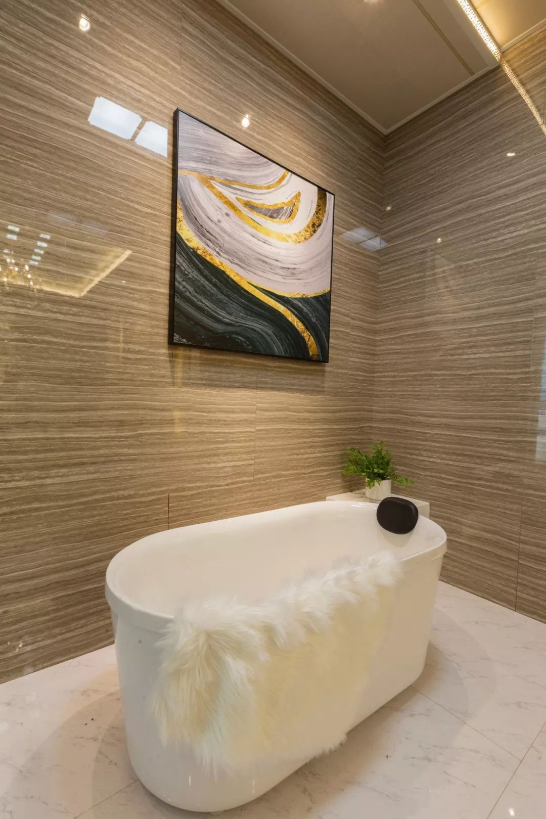 一株盆栽,一畫掛畫,將輕奢風格淋漓盡致的演繹出來,奢華而不高調,創造出舒適放松的浴室環境。在有限的空間中,引發無限的想象。