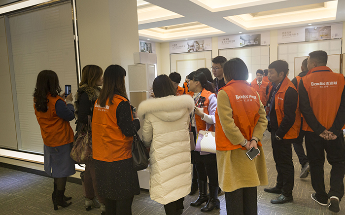 1月8日上午,經銷商家人有序回到巴迪斯總部,參觀新進落地就已在終端市場形成巨大口碑和影響力的第六代輕奢形象暨智慧門店,以及在全國各地重要工程項目中獲得極高贊譽的工程天花、鋁幕墻等產品。