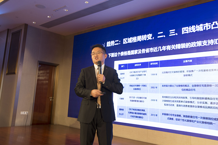 在渠道拓展篇《擁抱趨勢、遇見未來——精裝整裝時代下的新渠道模式》的主題演講中,潘總提到精裝整裝等領域大趨勢所驅,未來可期。面對如此利勢,潘總呼吁經銷商要積極響應公司號召,主動擁抱精裝整裝趨勢,從服務和設計、整體定制家居方案、搭建以設計為流量端口的商業平臺等方面提升和完善門店建設。