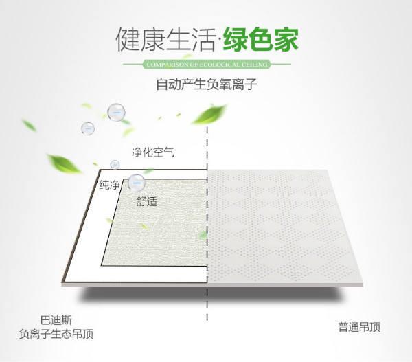 負(fù)離子生態(tài)吊頂,顧名思義,板材內(nèi)具有釋放負(fù)離子的特殊釋放層,且具有世界級(jí)的負(fù)氧離子增發(fā)量。安裝在家中,有效去除甲醛、TVOC、大腸桿菌、金黃葡萄菌等有害物質(zhì)。讓室內(nèi)空間成為負(fù)離子森林氧吧,足不出戶坐享健康生活。
