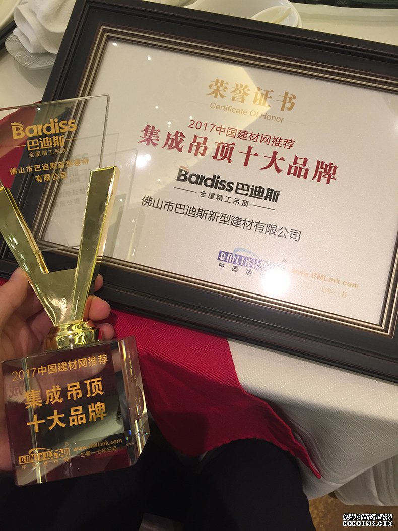 [詳細閱讀]2017年5月18日,由中國建材網主辦的“聚·合”第二屆中國建材行業高峰論壇暨2017中國建材網推薦品牌頒獎典禮在杭州隆重舉行,巴迪斯新渠道部代表總部出席此會議,并以絕對的優勢入選中國建材網推薦集成吊頂十大品牌。