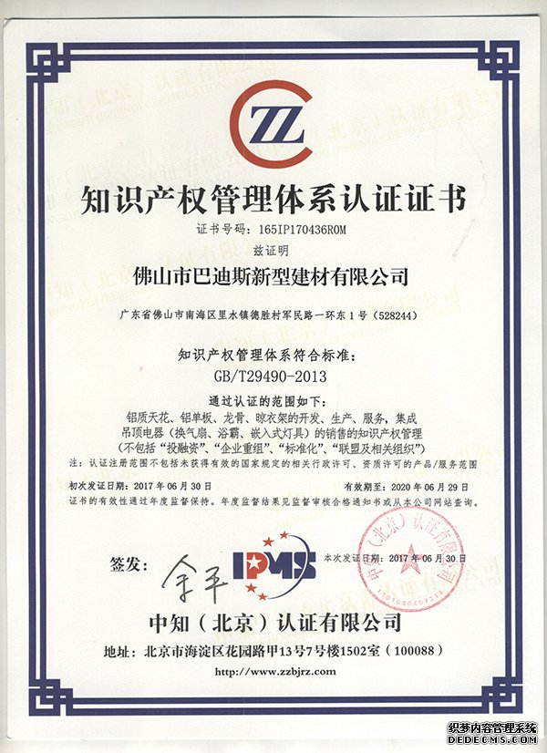 2017年6月30日,佛山市巴迪斯新型建材有限公司通過中知(北京)認證有限公司的知識產權管理體系評審,貫標成功,獲得GB/T29490-2013知識產權管理體系認證證書(證書號碼:165IP170436ROM)。