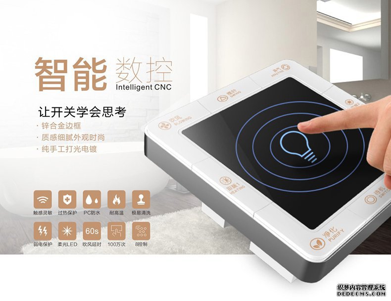 智能開關控制,鋅合金邊框,純手工打光電鍍,質感細膩,以精致外觀和創新設計掀起開關智控時尚風。觸摸只需0.1S即可響應,超越人體反應極限,即使在潮濕的環境下也能快速反應,不跳屏。還有出色的夜光導航,大屏幕的夜視觸控,方便老人與小孩容易找到開關,告別漆黑摸索。