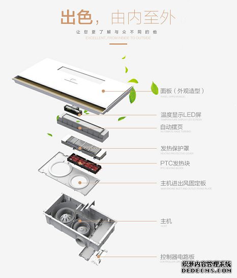 彩智暖風功能采用了優質陶瓷PTC進行發熱,達到2800W 大熱量恒定輸出,升溫快,恒溫發熱,熱力持久。陶瓷PTC取暖件輸出熱風更大功率、更速熱、更安全,打造浴室保暖大氣層。