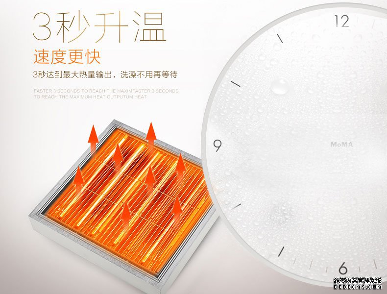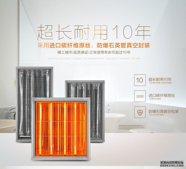 采用進口碳纖維絲進行加熱,瞬間升溫到650度,3秒輸出熱量,不用預熱等待。防水防潮,殺菌無死角,帶給你一個健康的環境。