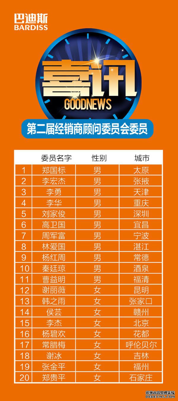 [詳細閱讀]22名新一屆委員名單新鮮出爐!近日,巴迪斯集成吊頂通過公平、公開、公正的投票方式產生了新一屆經銷商故為委員會委員名單。2016年,他們將在經銷商委員會的舞臺上唱主角。在22名新科委員中,委員有過半留任,具體人員名單如下(按姓名筆畫排序):