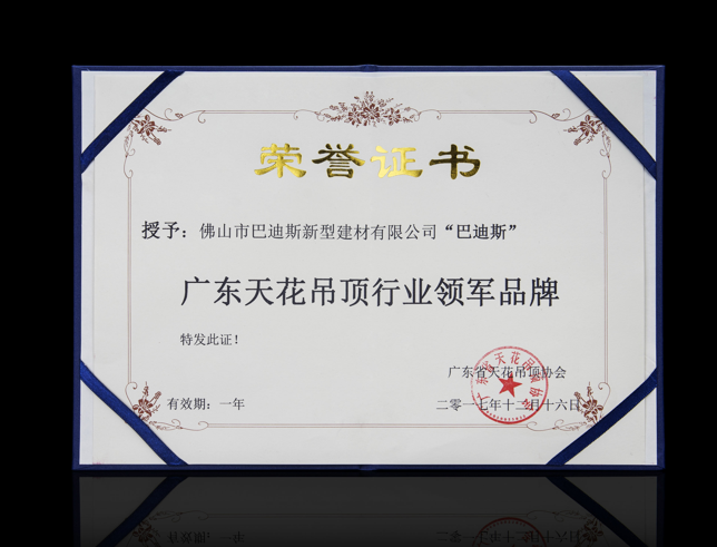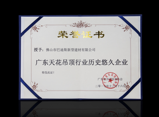 巴迪斯憑借優異的市場表現和行業影響力,榮獲:“廣東天花吊頂行業領軍品牌”、“廣東天花吊頂行業歷史悠久企業”,