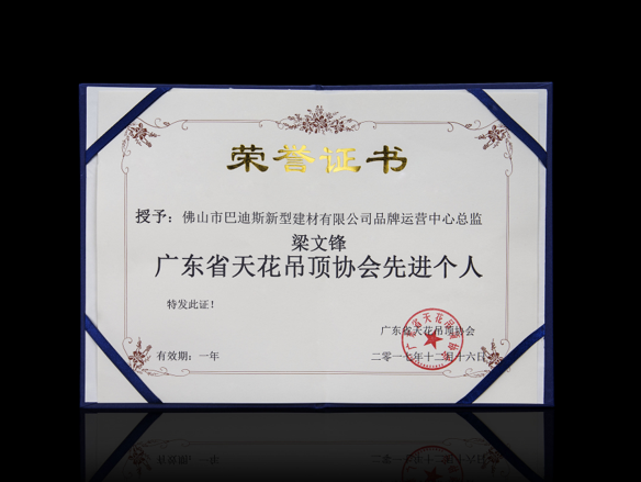 巴迪斯品牌運營中心總監梁文鋒榮獲“廣東省天花吊頂協會先進個人獎”。此次得獎,彰顯了