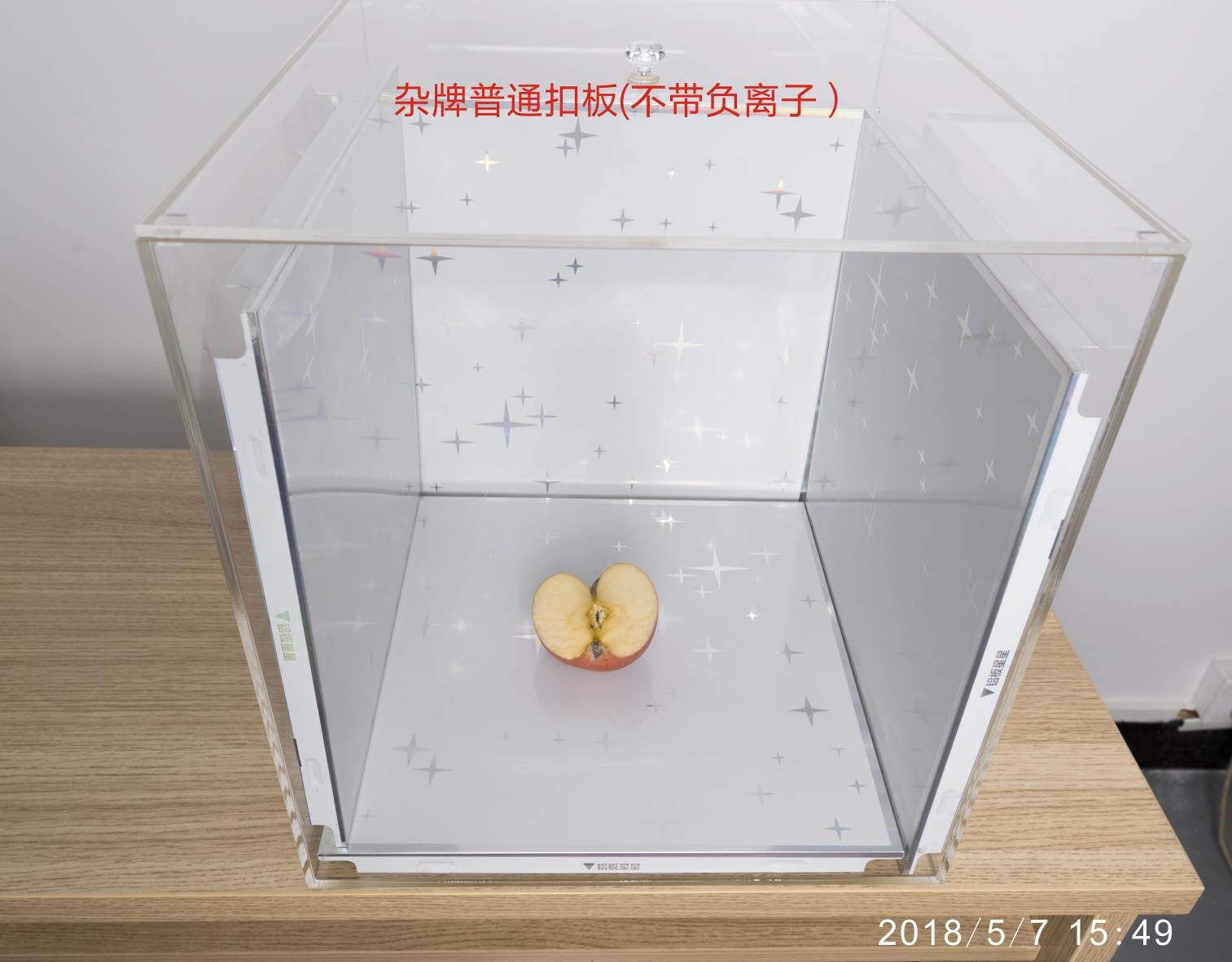 第二天,蘋果開始有一點變化,負離子扣板箱內蘋果切面繼續保持新鮮狀態。而雜牌普通扣板箱內蘋果邊沿開始出現黑邊。