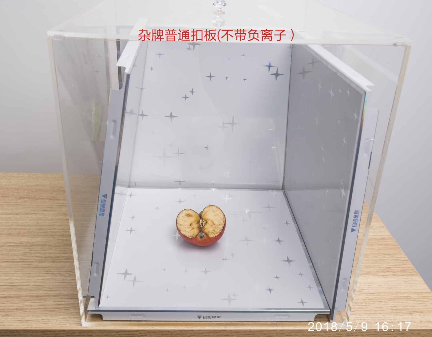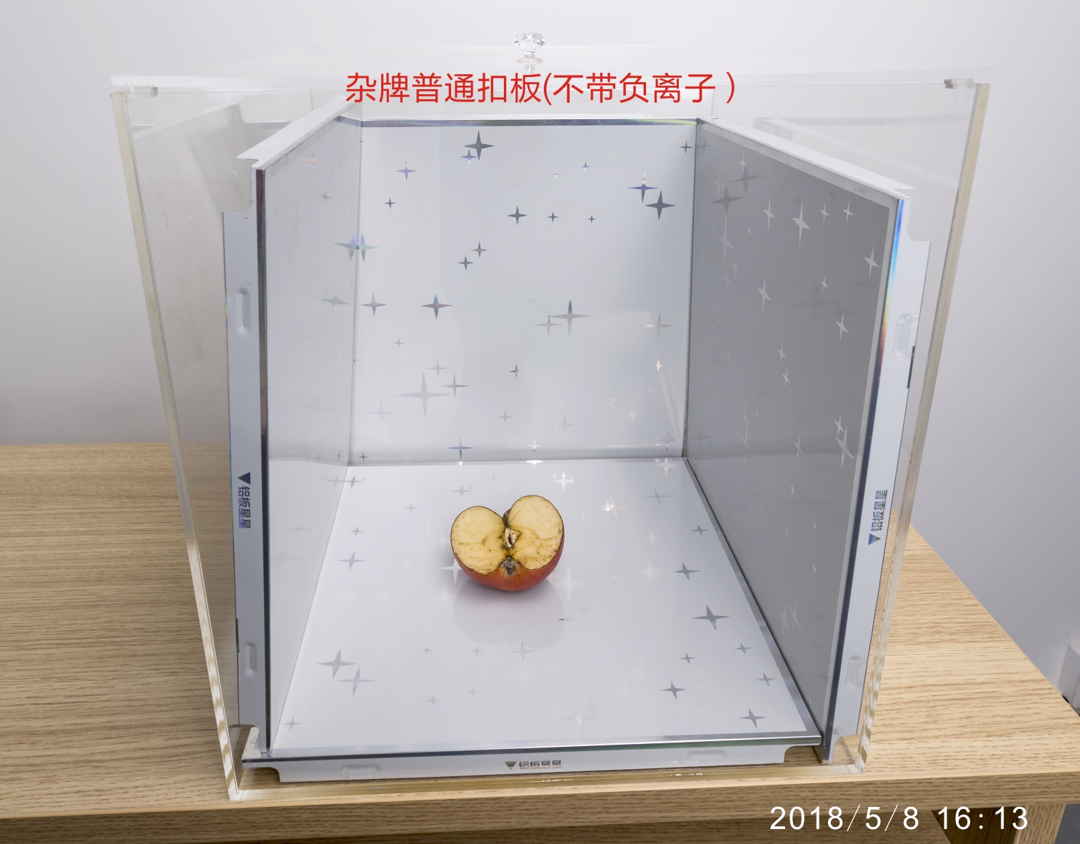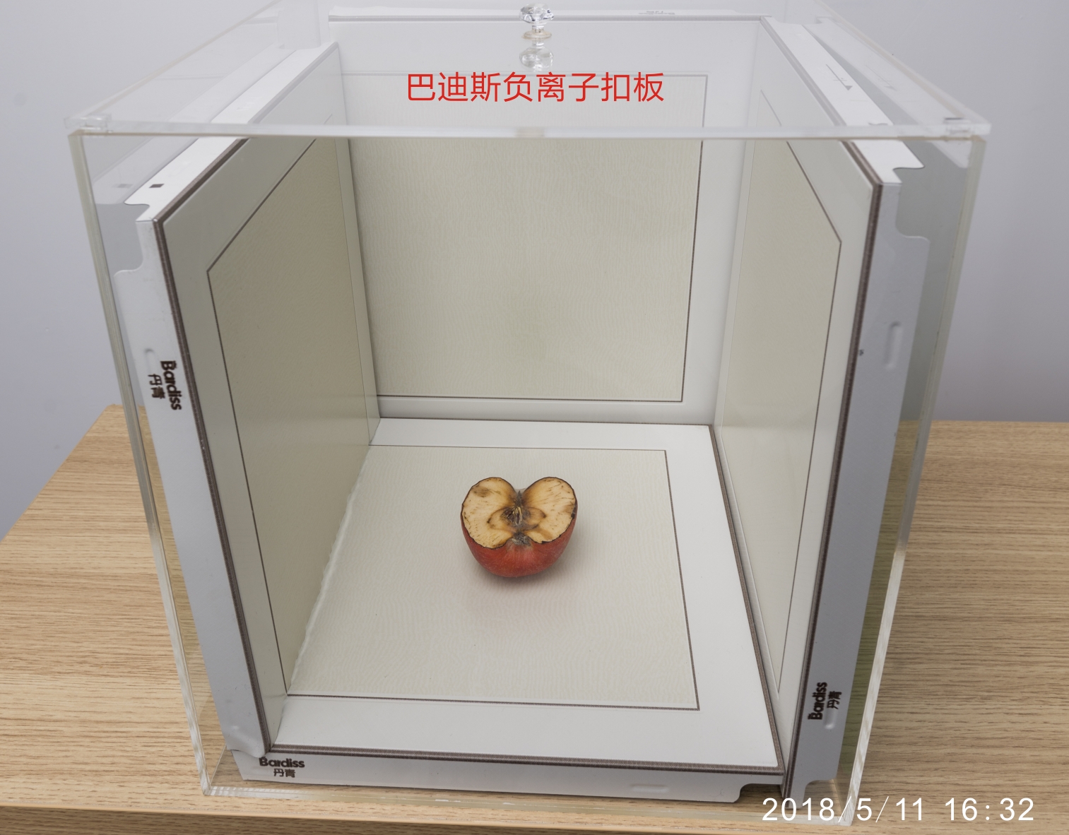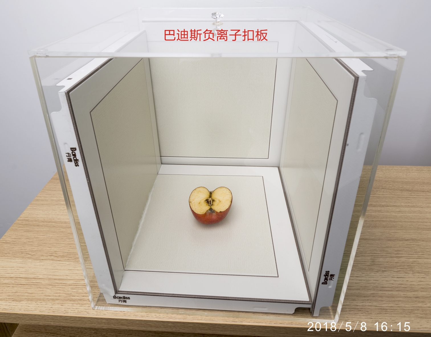 第二步:用已經消毒的水果刀把蘋果切成兩半,迅速將其中半塊放進帶負離子扣板箱內;剩下另外一半放入普通扣板箱內;