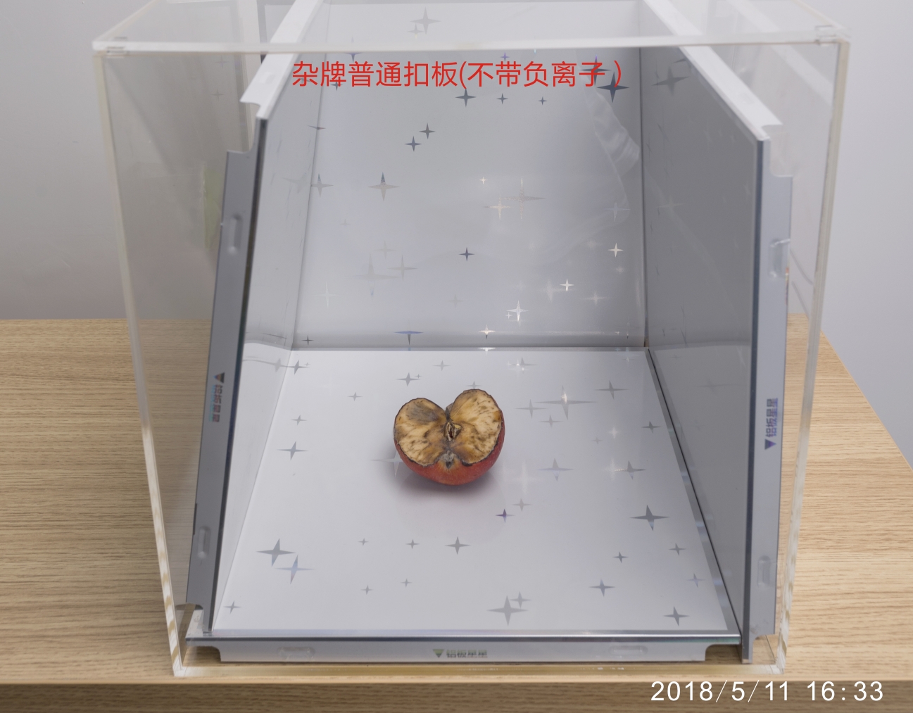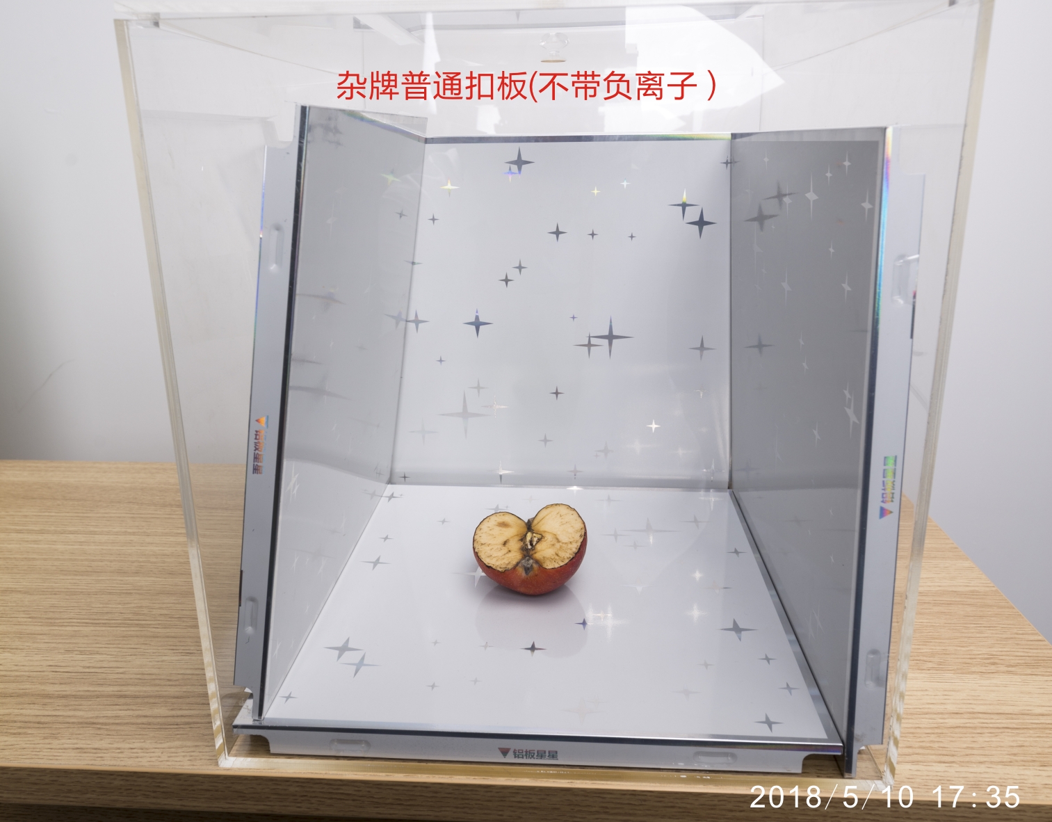 第四天,負離子扣板箱內蘋果繼續保持一定新鮮狀態,只有邊沿處顏色加深一點而已。而雜牌普通扣板箱內,蘋果棕黑色霉變加深。