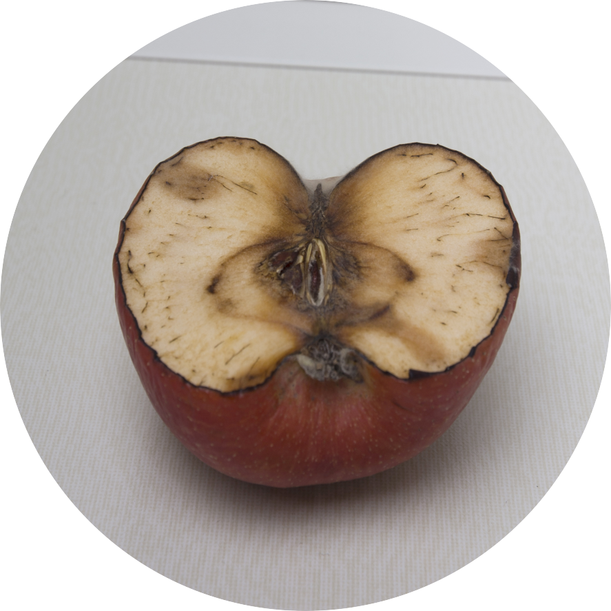第五天,兩個箱體里面蘋果已經出現明顯差距,帶負離子扣板箱內蘋果切面肉色新鮮,局部地方還依然保持切開狀態時候顏色,只有局部地方出現黑棕色。雜牌普通扣板箱內蘋果整個切面已經變色,局部地方已經開始發黑并出現霉變。