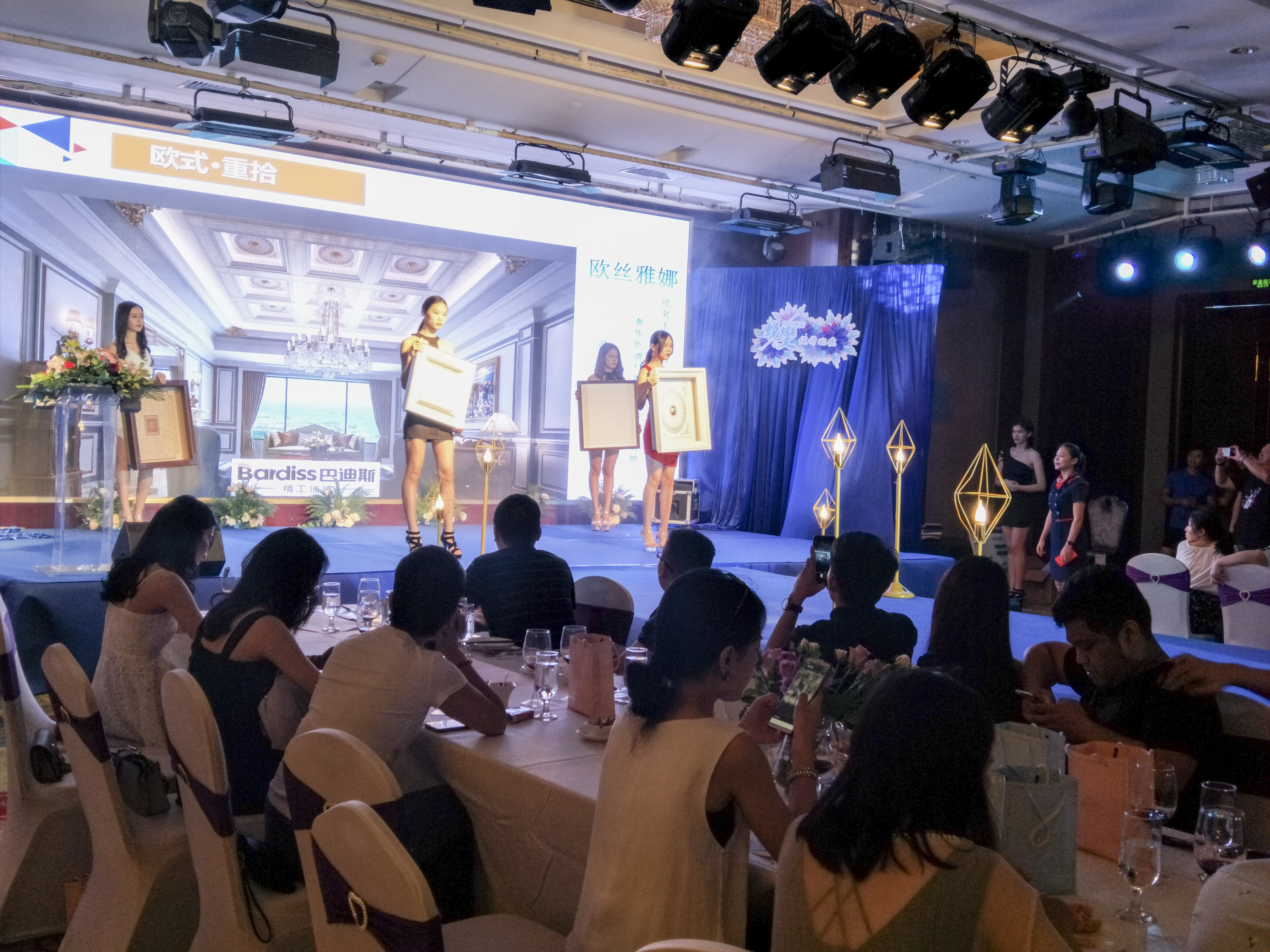 清遠巴迪斯全屋精工吊頂、蒙娜麗莎瓷磚、伊元素背景墻、佳櫥維思櫥柜、德水凈水五家行業頂尖品牌作為本次夜宴的主辦方,向在場的來賓闡述了產品效果圖的設計理念,并通過模特走秀的形式展示了各自的產品,獲得了現場來賓的熱烈好評,并征服了一批家裝公司。