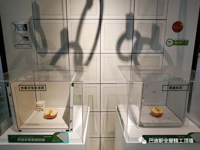 ▲負(fù)離子應(yīng)用之蘋果保鮮實(shí)驗(yàn),讓觀展者更直觀地看到負(fù)離子生態(tài)吊頂?shù)墓δ?br />