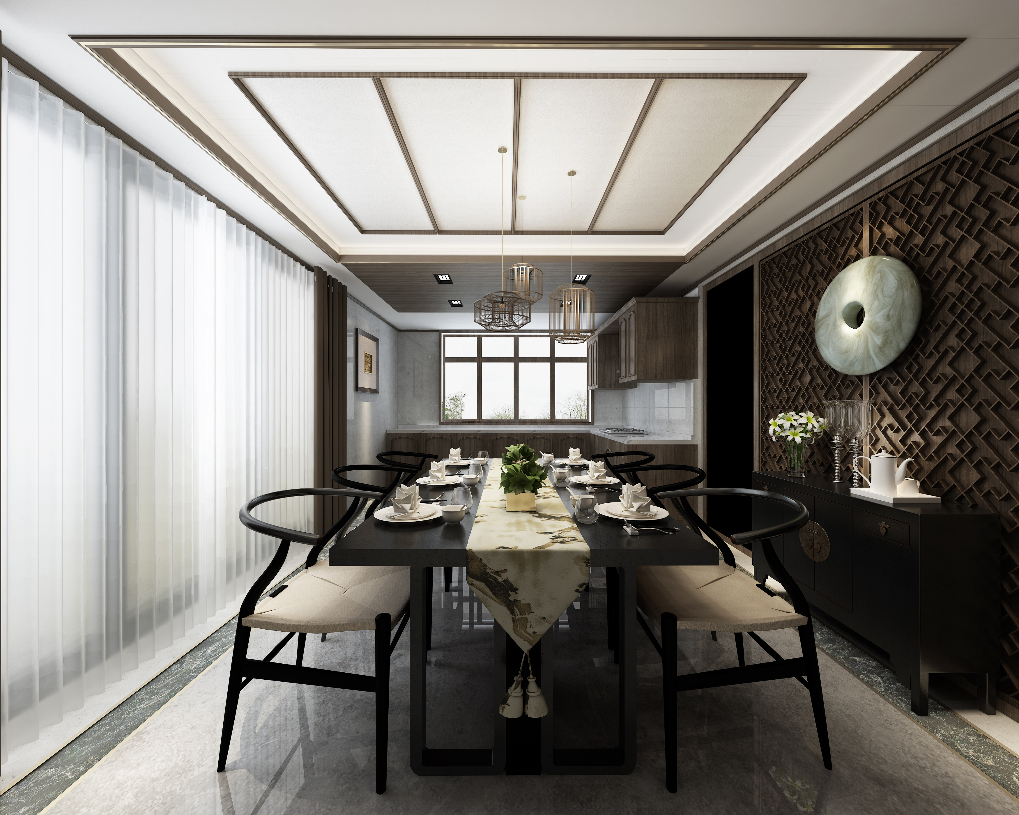 以黑白灰色系突顯木紋的本身氣質(zhì),使空間布局與功能用途完美結(jié)合。簡單的餐桌搭配簡潔的燈具,恰到好處的配置,沒有一點冗余。新中式餐廳的完美劃分,讓人感受簡約、明快的城市氣息。