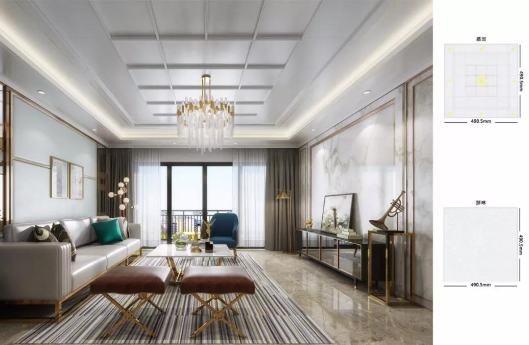 圖中的客廳,采用了巴迪斯精工頂墻的“慕雪”和“瑟琳”兩個輕奢風格的吊頂板材